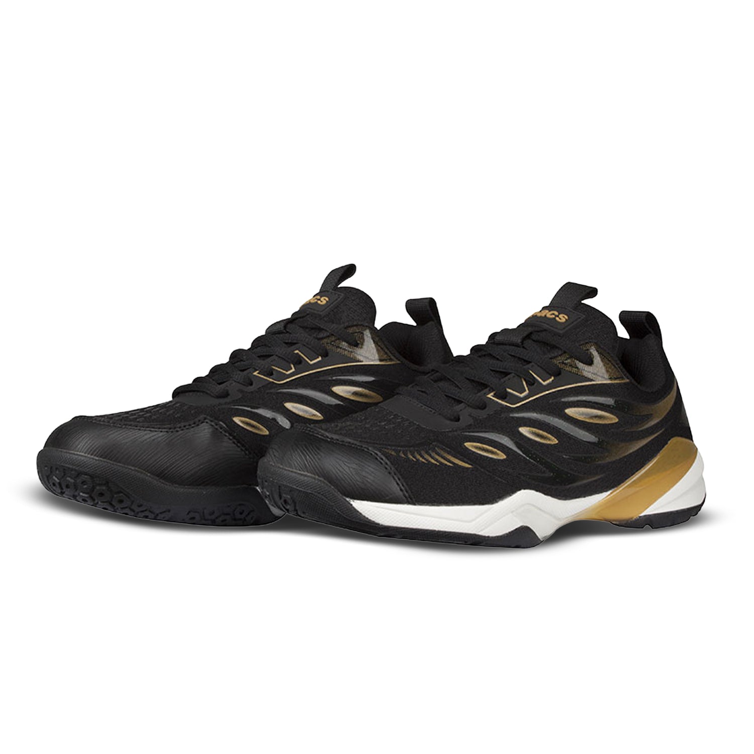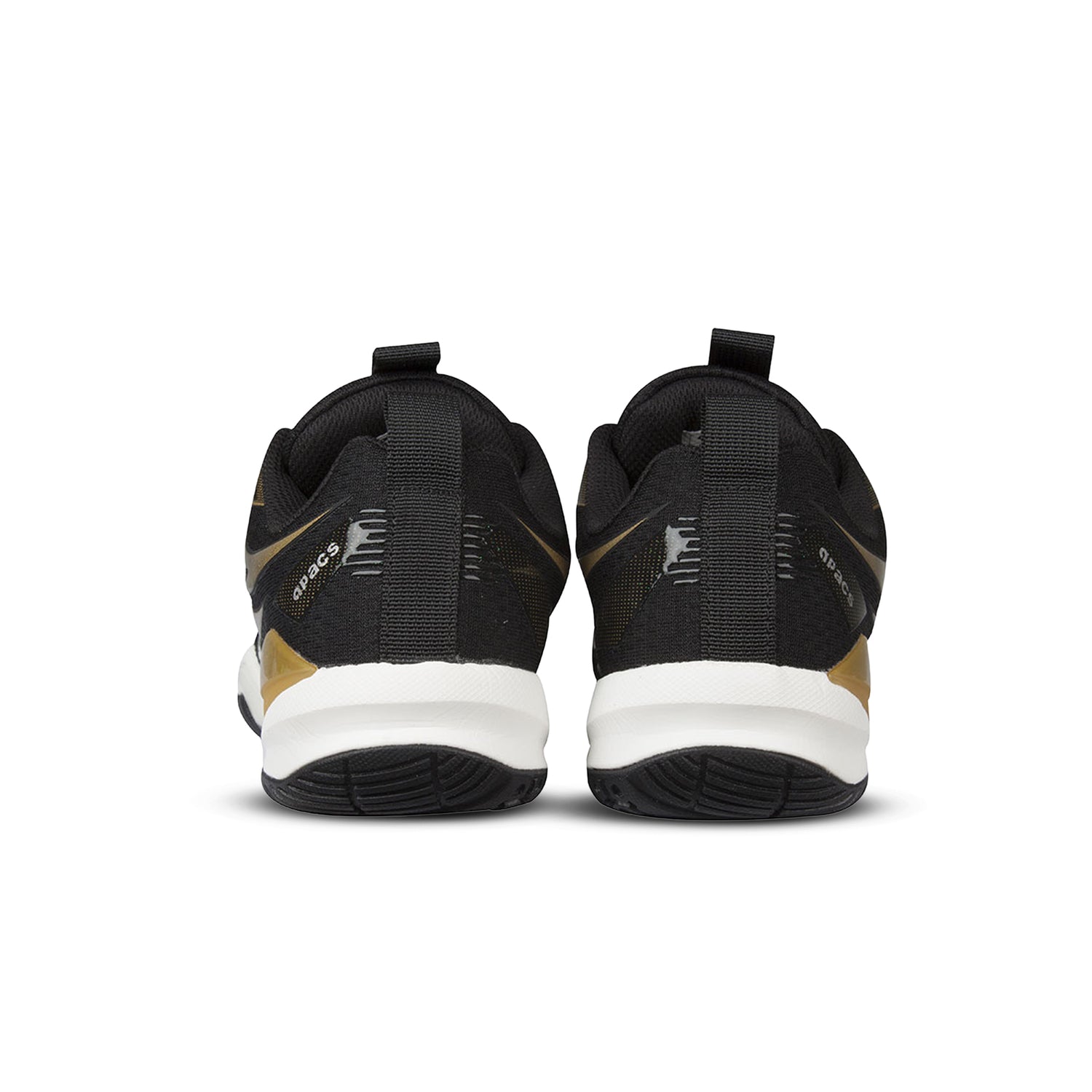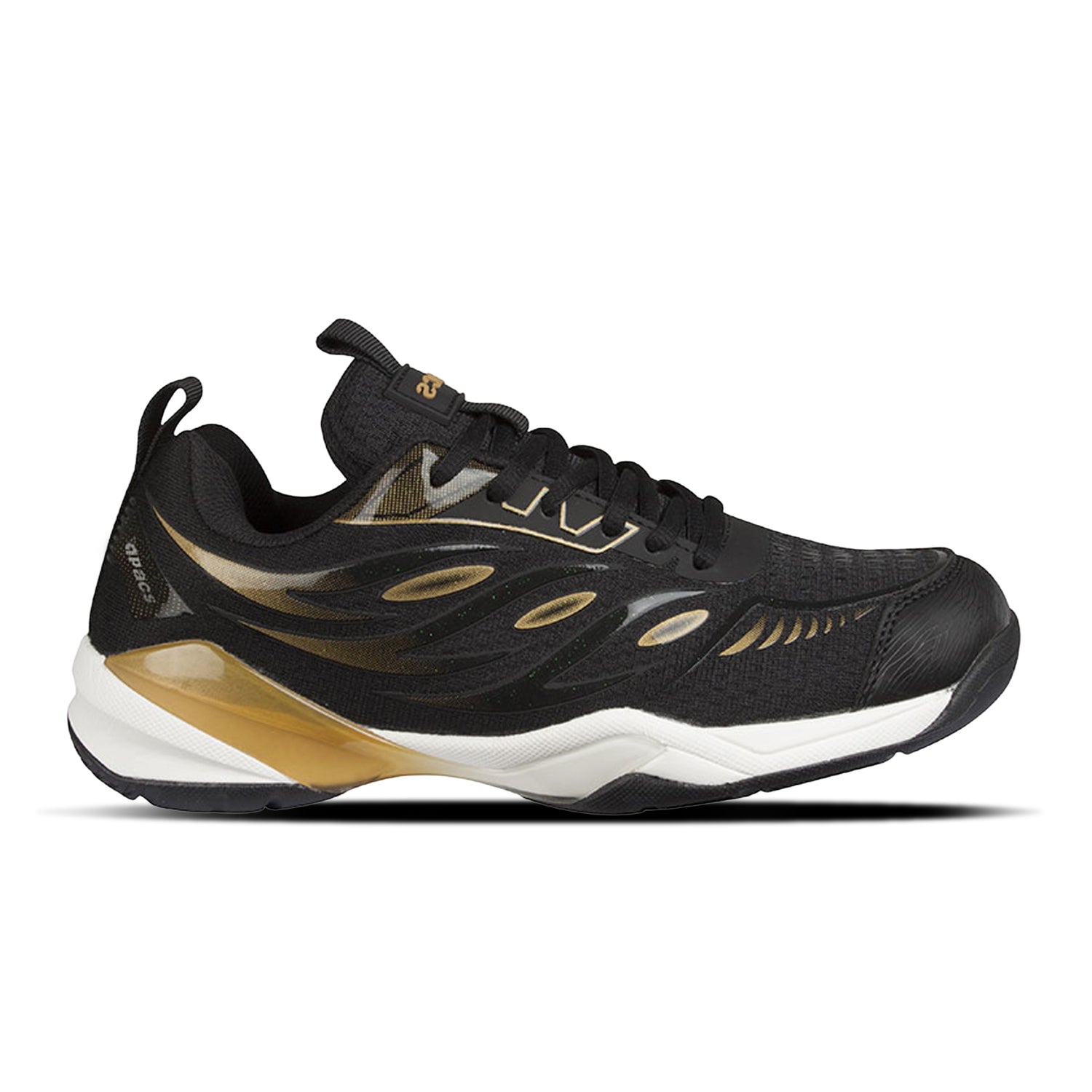The Apacs Performance 670 in black and gold (BLK/GLD) in size 8.5 (UK size 8.5, which corresponds to approximately 27.5 cm or EUR 43) is a badminton shoe designed for stability, grip, and comfort.