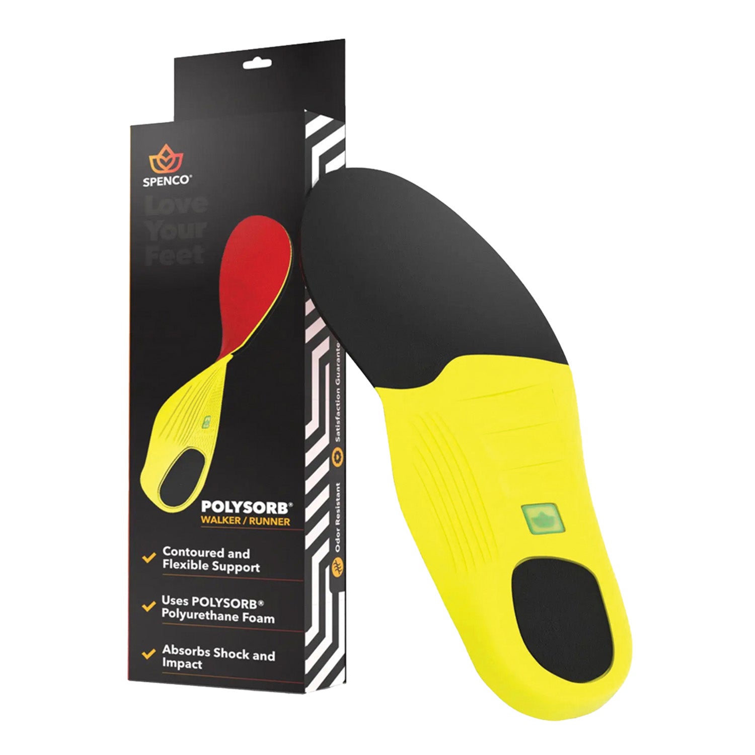 The Spenco Polysorb Walker/Runner Insole offers contoured, flexible support to walkers, runners, and joggers looking for additional comfort and cushioning. It also provides targeted shock absorption for rear foot impact. Ideal for use in athletic, running, or walking shoes, the Polysorb Walker/Runner Insole is made with Spencore material to absorb shock and impact for intense comfort and cushioning while the Spencore heel plug provides additional cushioning and shock absorption in the heel area. Lightweight Polysorb polyurethane foam provides heel cupping for a better fit and contoured arch support. To use the Spenco Polysorb Walker/Runner Insole, simply remove the original insole from your shoe and use it as a guide to trace and trim the replacement insole before inserting it into your shoe. Hand wash in warm water and air dry as needed. The Spenco Polysorb Walker/Runner Insole comes with a one-year unconditional guarantee.